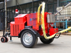 在工作时首先在料箱内加入沥青或灌缝胶,启动发电机供电,依次间断打开导热油泵开关,燃烧器开关,出料管加热开关;调整自动温控系统与材料的温度相同,通过柴油燃烧器自动加热熔料箱内导热油开始升温(拖式为强制循环)使材料融化,温度是通过自控系统来控制。溶料时间大约30-40分钟左右。在材料融化、出料管温度达到后可以进行工作。手持灌缝管对正裂缝灌缝处理。沥青泵的出料流量可调。在工作过程中随时添加材料保证工作的连续性。在灌缝前要对裂缝内的尘土进行清缝处理。